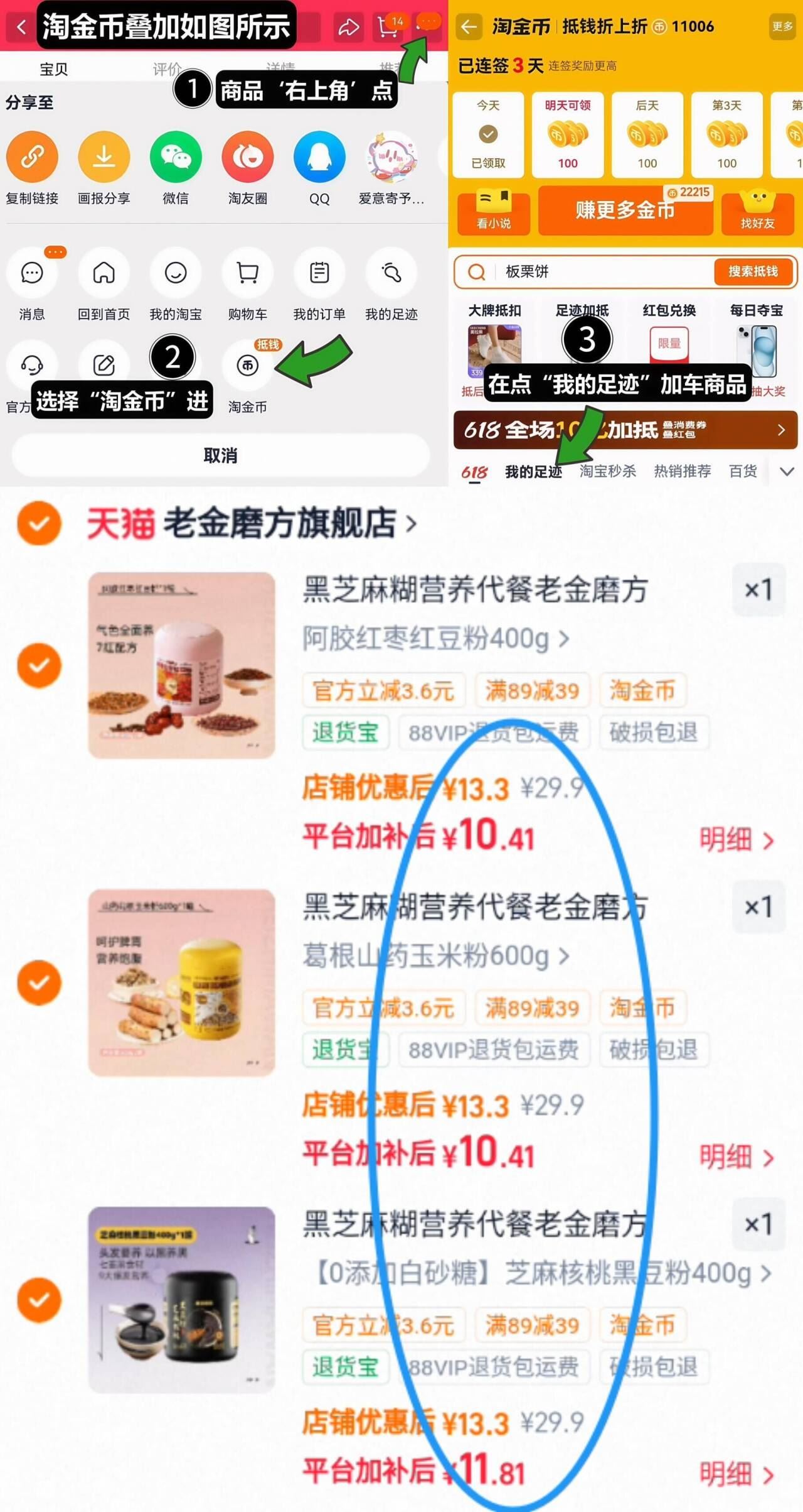①如图点右上角3个点,选淘金币