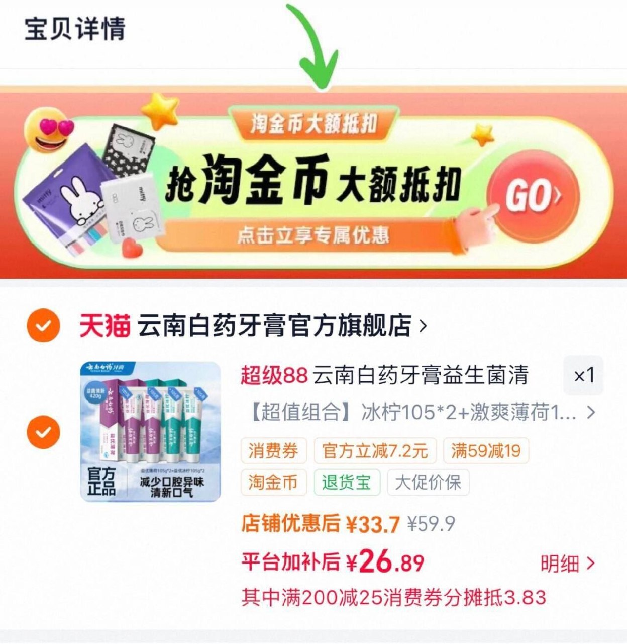 1、“下拉金币”加1件 【云南白药】牙膏105g*4支 -(egvn56ISi4u)/ Cb79 — 2、凑1件,用消费券 -(AqpD56I6Gm8)/ Cb79