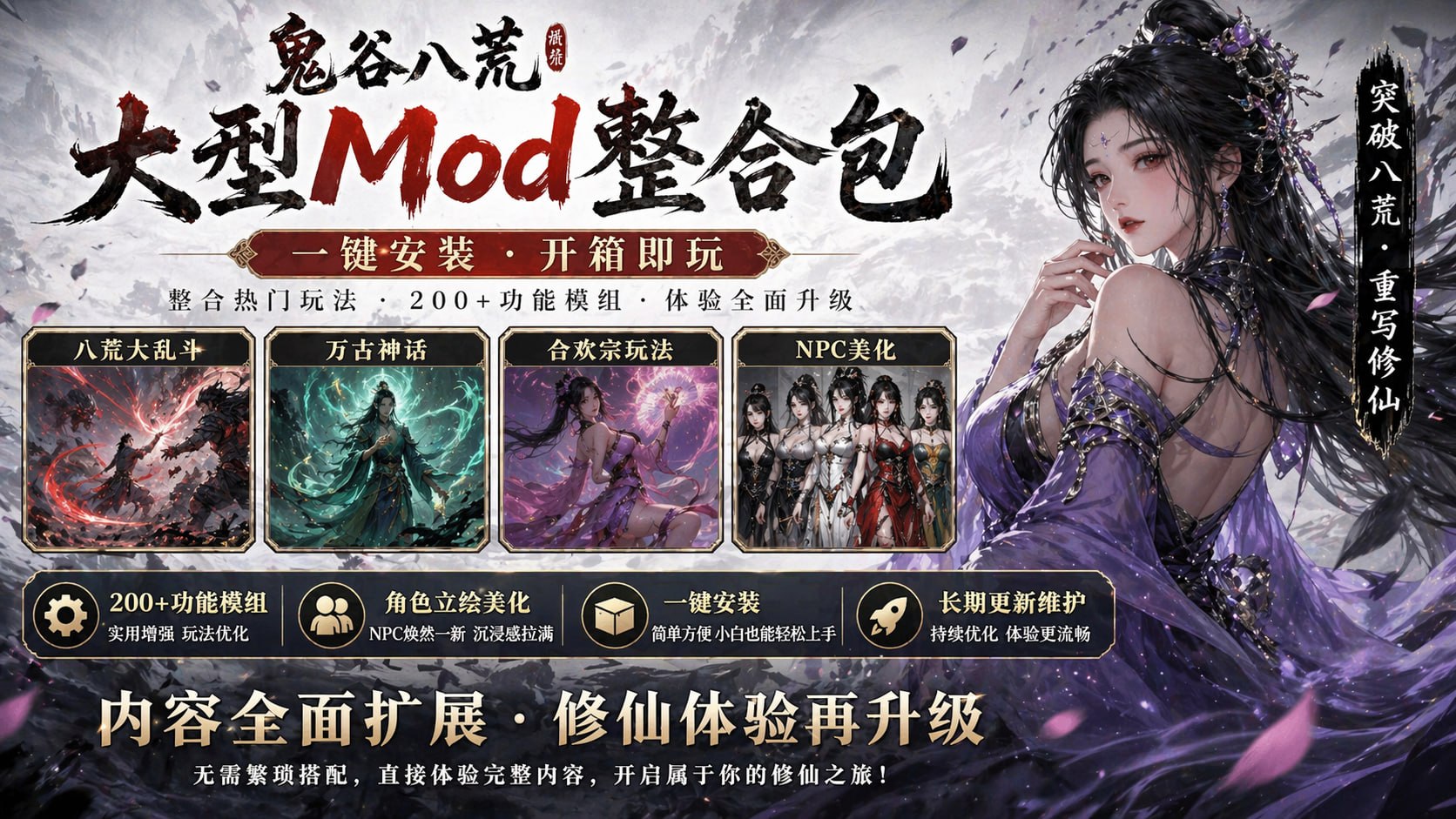 说明: 整合八荒大乱斗、万古神话、合欢宗等热门玩法,内容全面扩展。内置200+功能模组,涵盖实用增强与玩法优化。