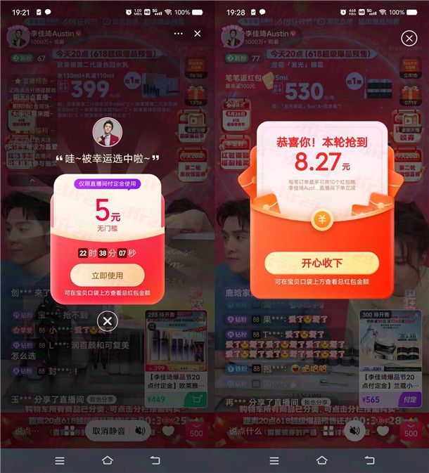 参加淘宝李佳琪直播间分享500万红包雨活动。打开淘宝APP搜索[李佳琪直播室]进入直播间,点击右上角“500万红包雨”即可参与。每5分钟就会有一轮红包雨。最多可以获得30波红包雨,每轮可以获得几元钱。总共应该有几十元、几百元。小编测试2轮获胜8.27元+8.33元。您获得的红包可以在李佳琪直播间购买商品时扣除。每个订单最多可以使用10个红包。