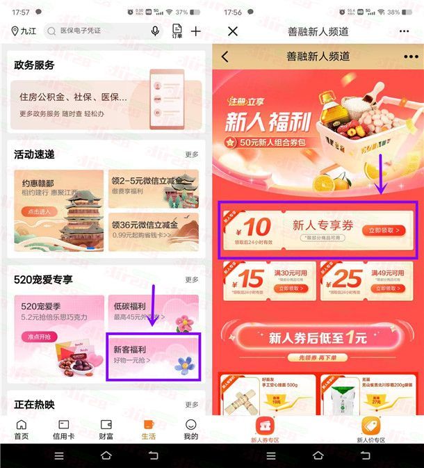 小编提示:打开中国建设银行APP,点击底部的[生活],点击下拉页面的[新人福利],即可领取10元优惠券。收到优惠券后,下拉页面上有几款商品可以1元包邮即可购买。