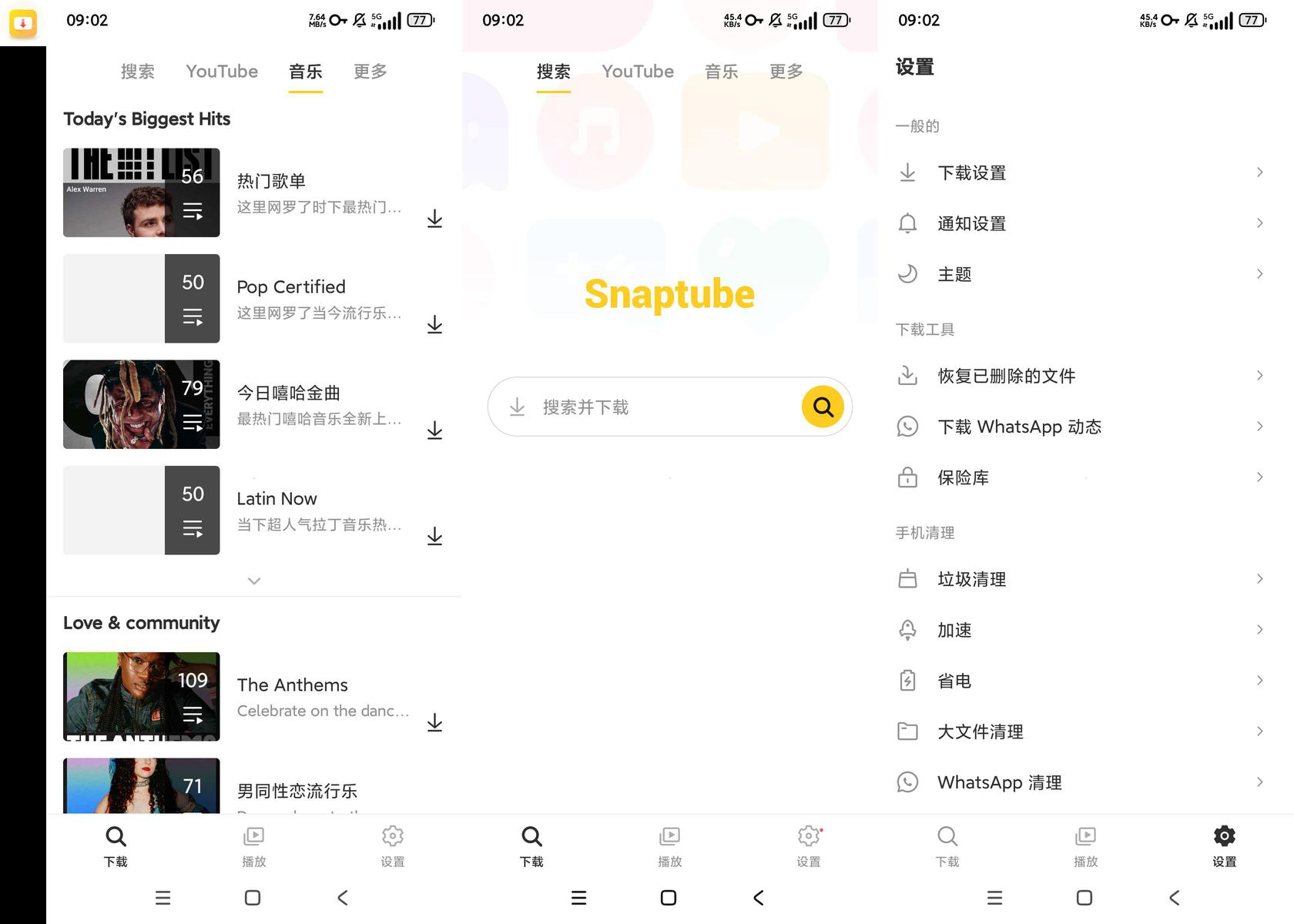【应 用 介 绍】:Snaptube是一款有着强大功能的可以直接下载视频,音乐,MV等资源的软件, 该软件中资源丰富,用户在这里是可以直接使用资源的,也可以免费下载。载任何音乐视频直接作为MP3格式文件,下载速度可观,轻松获得喜欢的音频资源,操作便捷简单,快速掌握软件使用技巧,资源高清优质,想要观看的影片一触即达,可以轻松下载。