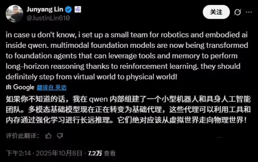 10 月 9 日消息,阿里通义千问大语言模型负责人林俊旸 10 月 8 日在社交媒体 X 上发文表示,已组建机器人和具身智能的小型团队。他表示,多模态基础模型正转变为基础智能体(agents),这些智能体可以利用工具和记忆通过强化学习进行长视野(long-horizon )推理,“它们绝对应该从虚拟世界走向物理世界”。