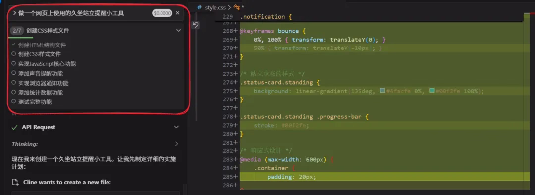 之后就可以在VScode里使用了,像是我们来说一个简单的需求,现在坐办公室都喜欢久坐,需要一个提醒工具,直接跟它说,做一个网页上使用的久坐站立提醒小工具。