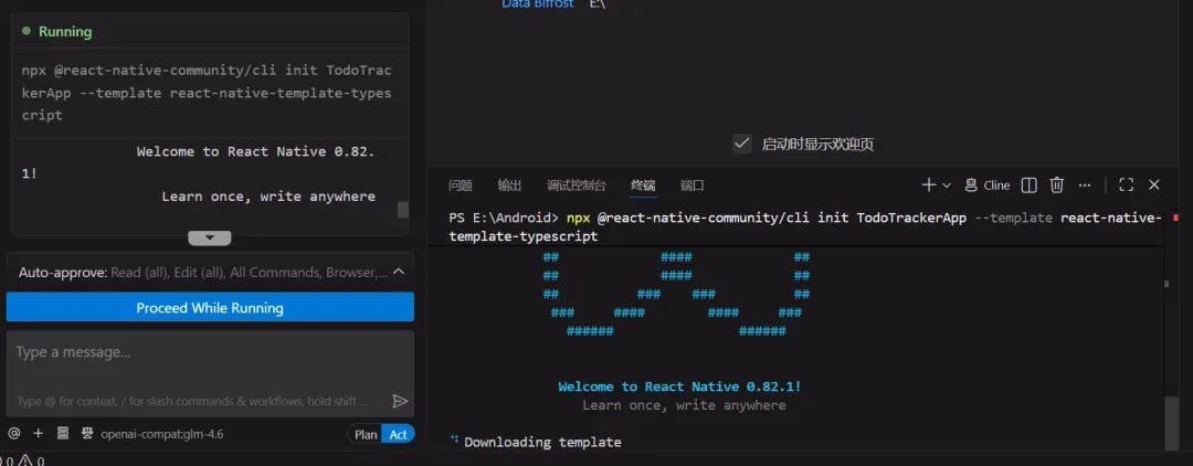 然后GLM-4.6就会自己去分析项目需要的内容,调用命令行来完成项目环境的配置,像是配置React Native这些,只需要在安装过程中手动输入一下Y确认就可以了。