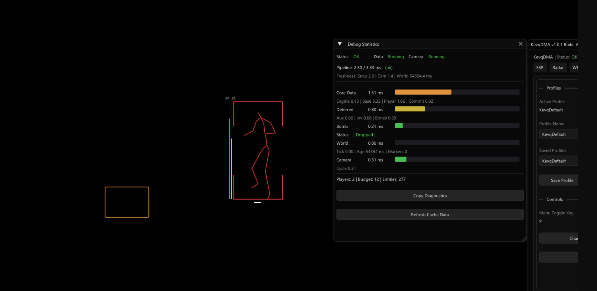 本工具支持双机+DMA配置下的ESP功能,全部代码和示例仅供个人学习研究使用。请严格遵守游戏平台规则,切勿用于实际对战。